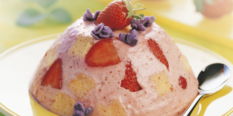 - Alles in die Schüsseln füllen und für ca. 7 Stunden kalt stellen. Aus der Kuppelform heben und die Frischhaltefolie abziehen. Mit Erdbeeren und kandierten Blüten garnieren.