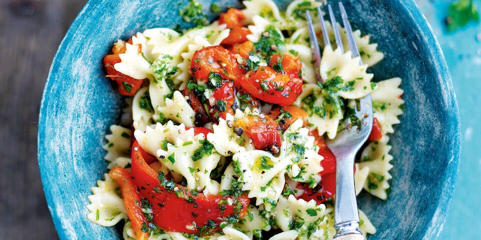 - Die Nudeln in Salzwasser al dente garen. Von den Paprika mit einem kleinen Messer die Haut abziehen, in Stücke schneiden und zu den Paradeisern geben.