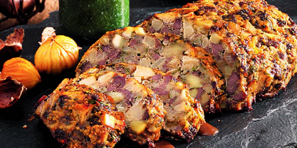 3. Mit Salz, Pfeffer und Wildgewürz würzen. Die Masse zu einem länglichen Laib formen (ca. 15 x 20 cm) und in einen Bräter mit Butterschmalz setzen.
