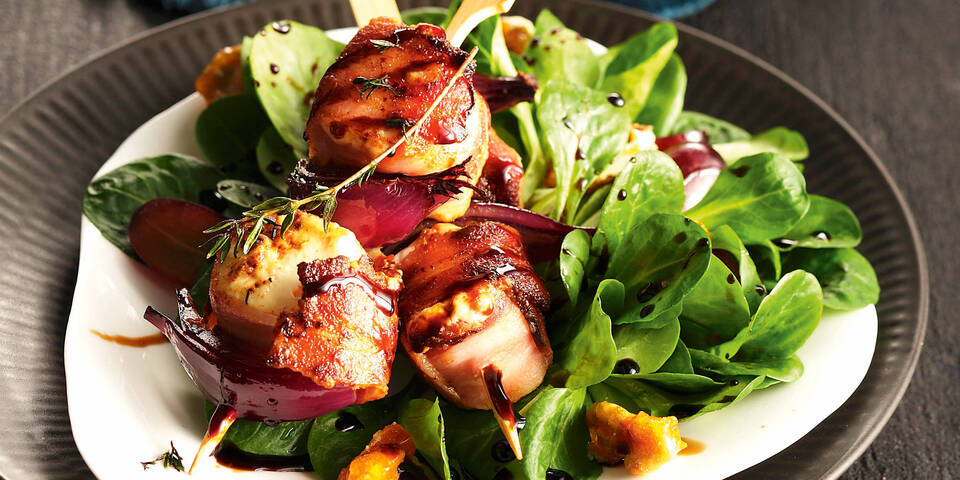 - Die Spießchen auf den Salat legen und mit dem Dressing beträufelt servieren. Nach Belieben mit karamellisierten Nüssen garnieren.
