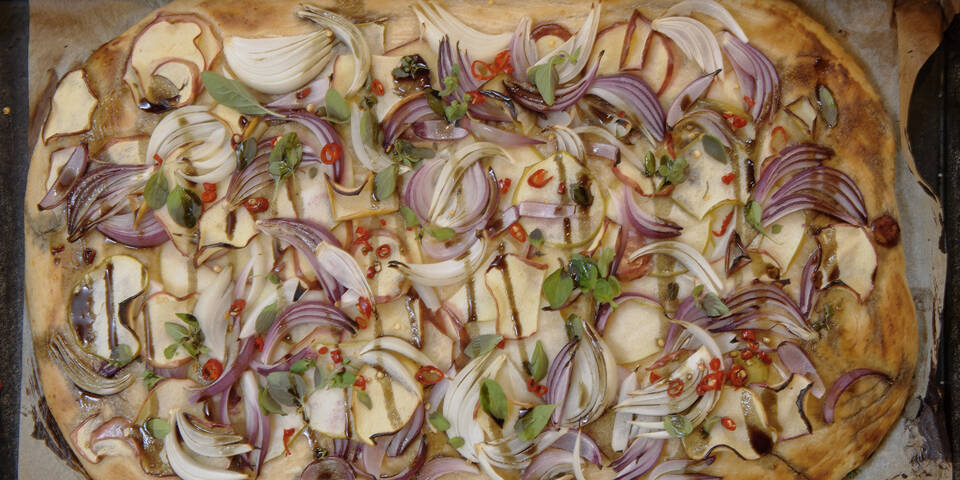 - Den Knoblauch klein schneiden und darauf verteilen. Äpfel und Zwiebel in 3 mm dicke Scheiben schneiden, gut durchmischen und auf den Teig geben. Für 25 Minuten bei 200 °C Ober- und Unterhitze ins Rohr geben. 1 Minute vor Ende der Backzeit den Chili darüberstreuen und fertig backen. Aus dem Rohr nehmen, Majoran darübergeben und mit Kürbiskernöl beträufeln. Zuletzt mit Salz und Pfeffer würzen.