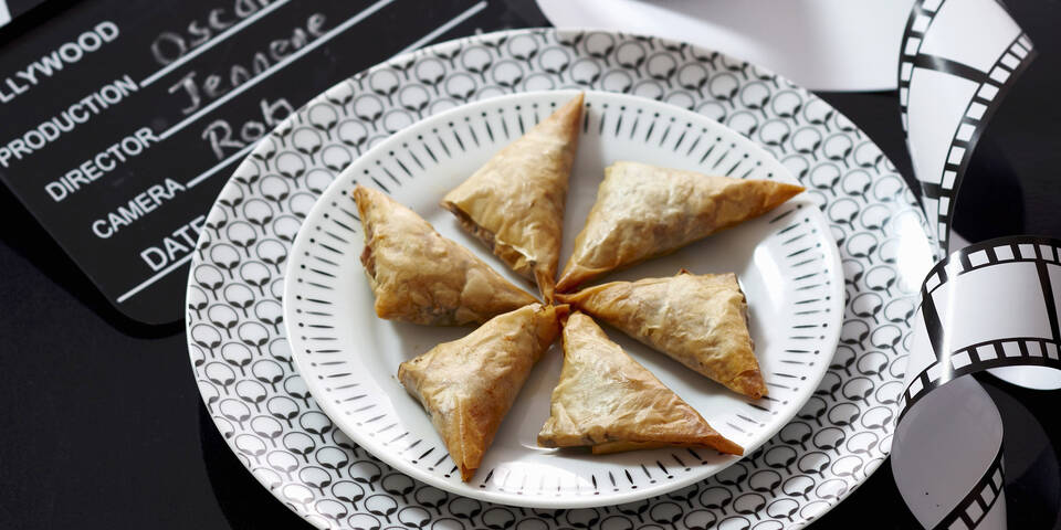- Dreiecke auf ein mit Backpapier ausgelegtes Backblech legen und mit der restlichen Butter bepinseln. Im heißen Ofen 15–20 Minuten goldbraun backen. Aus dem Ofen nehmen und noch warm oder ausgekühlt servieren.