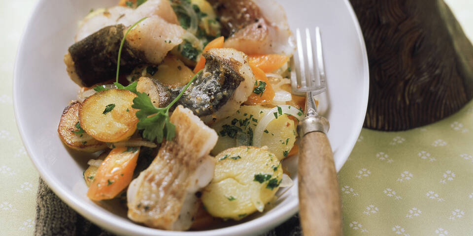- Die Erdäpfel und Karotten in Öl in einer unbeschichteten Pfanne 10 Minuten unter Wenden goldbraun braten. Salzen, pfeffern und die Petersilie zugeben. Die Schalotten in einer Pfanne in heißer Butter anschwitzen. Gestoßene Pfefferkörner und Wacholderbeeren zugeben und den Wels mit der Hautseite in die Pfanne geben.