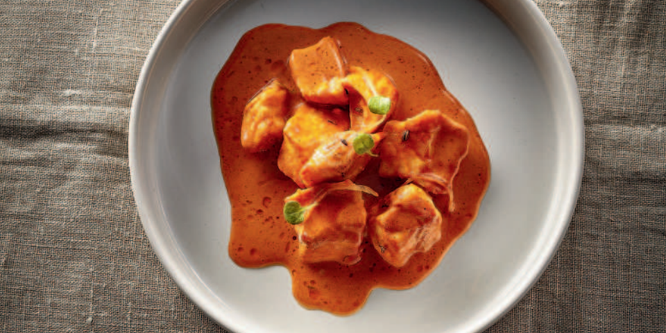 3. Mit dem Tomatenmark tomatisieren (kurz mitanschwitzen) und wiederum kurz weiterdünsten. Das Paprikapulver zugeben und mit dem Weißwein ablöschen. Reduzieren lassen und mit Fischfond oder Wasser auffüllen.