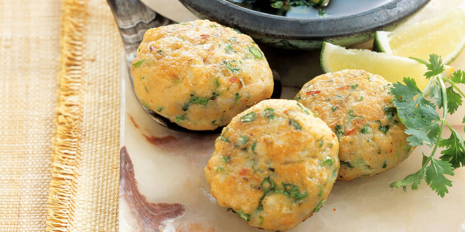 - Aus der Fischmasse 12 Laibchen formen und in einer Pfanne im heißen Öl pro Seite ca. 4 Minuten portionsweise goldbraun braten. Mit Limettenspalten garniert servieren.