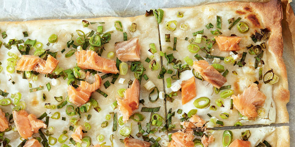 - Den Lauch in Ringe schneiden und blanchieren, dann auf die Sauerrahm-Mischung geben. Zuletzt die Lachsforelle in Würfel schneiden und auf dem Flammkuchen verteilen.