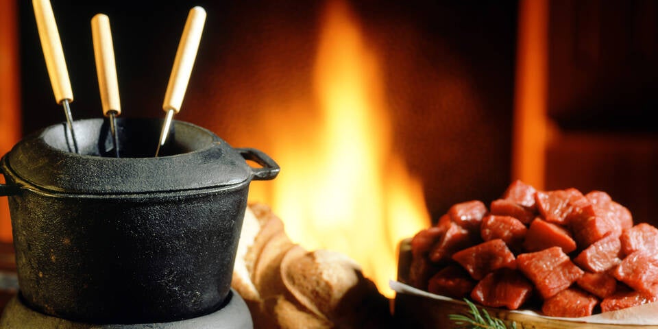 - 800 g Fleisch (z. B. von Geflügel, Rind, Schwein, Lamm) parieren, in mundgerechte Würfel schneiden. 2 l Öl im Fonduetopf auf dem Herd erhitzen, auf ein Rechaud stellen und darauf heiß halten. Fleisch in heißem Öl garen.