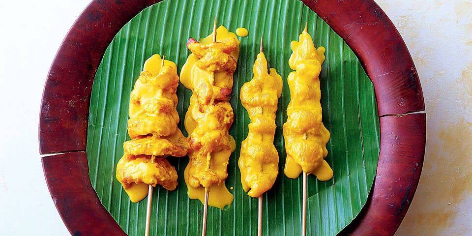 - Restliche Zutaten zu einer Marinade verrühren und die Fleischstreifen darin einige Stunden marinieren lassen, dann herausnehmen, abtropfen lassen und wellenförmig auf acht Holzspießchen stecken und ca. 8 Minuten grillen, gelegentlich mit Marinade bestreichen (oder in heißem Öl braten).