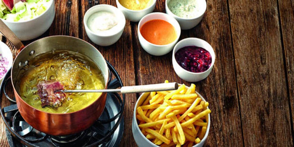 2. Für das Fondue das Fleisch in mundgerechte Stücke (2–3 cm groß) schneiden, kalt stellen und ca. 30 Minuten vor dem Essen raus stellen. Dazu passen folgende Beilagen: Pommes frites, Eisbergsalat und gegrillte Paprika.