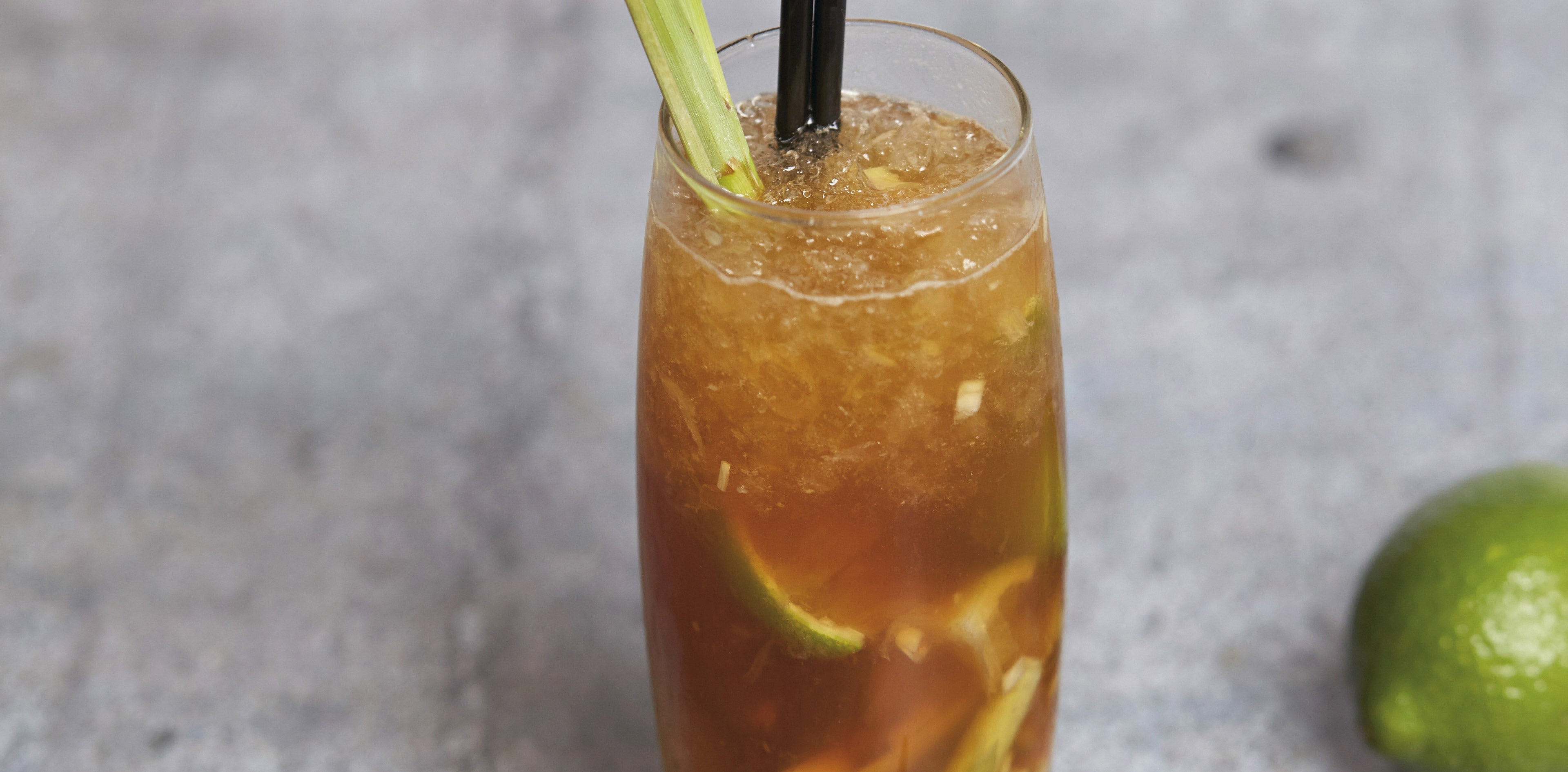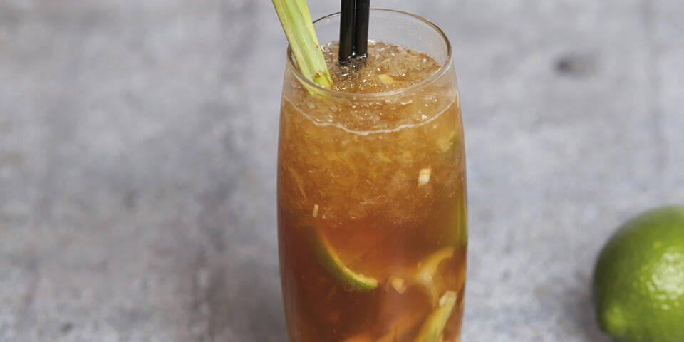 Lemongras mit der Limette und Vanillezucker im Glas muddeln und mit Crushed Ice auffüllen. Alle restlichen Zutaten hinzufügen und gut rühren.