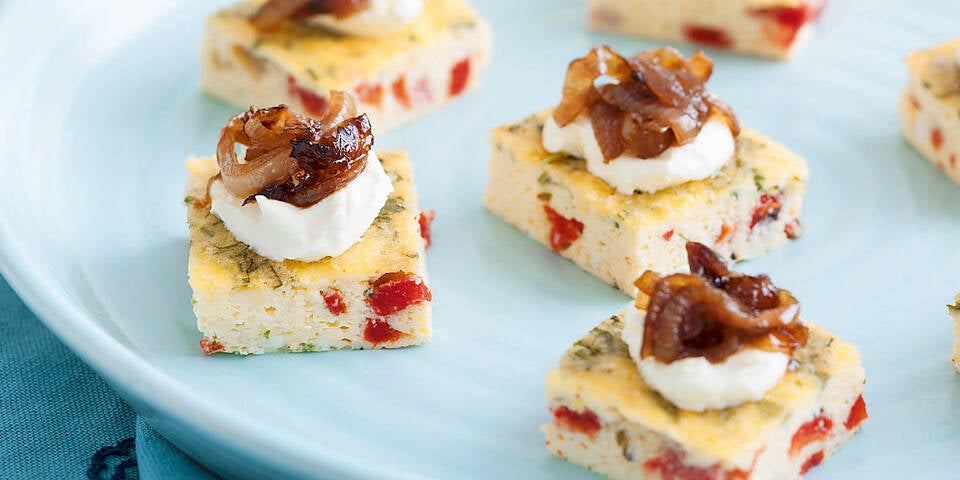 - Auf jedes Frittata-Stück etwas Sauerrahm setzen, darauf die Zwiebeln verteilen und die Canapés auf einer großen Platte angerichtet servieren.