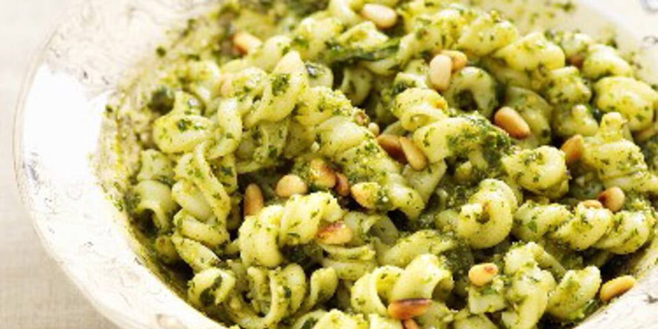 Die Fusilli in Salzwasser bissfest kochen. Das Basilikum waschen, trocken schütteln und die Blättchen von den Stielen zupfen. Den Knoblauch schälen und hacken. Das Basilikum mit dem Knoblauch und Pinienkernen im Mixer zerkleinern, den Käse und nach und nach das Olivenöl unterrühren bis ein sämiges Pesto entstanden ist, evtl. etwas Nudelkochwasser ergänzen und mit Salz und Pfeffer abschmecken. Die Fusilli abgießen, abtropfen lassen und das Pesto untermischen. Auf Tellern anrichten und mit Basilikumblättern und Chili garniert servieren.