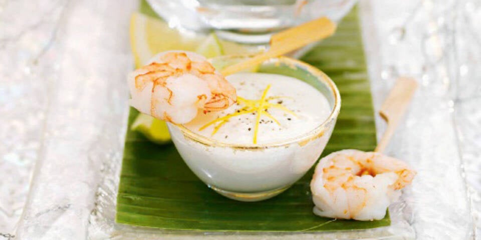 - Die Garnelen waschen, trocken tupfen und in einer Pfanne in heißem Öl und Butter ca. 4 Minuten rosa braten. Mit Salz und Pfeffer würzen, dann einzeln auf kleine Holzspießchen stecken. Den Dip mit Zitronenzesten und Pfeffer garnieren und zu den Garnelenspießchen reichen.
