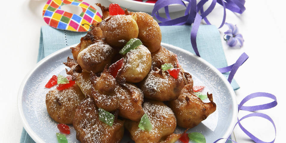 - Das Öl in einem Topf erhitzen und den Teig mit Hilfe eines Esslöffels portionsweise in das heiße Fett gleiten lassen. Unter Wenden goldgelbe Bällchen ausbacken, mit einem Schaumlöffel herausnehmen und auf Küchenpapier abtropfen lassen. Mit Staubzucker bestauben und nach Belieben mit kandierten Früchten bestreut servieren.
