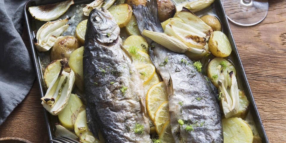 - Den Fenchel waschen, putzen und in Spalten schneiden. Das Fenchelgrün hacken und ein wenig davon zum Garnieren beiseitelegen. Die Erdäpfel leicht abkühlen lassen und halbieren. Zusammen mit dem Fenchel auf einem gebutterten Backblech verteilen. Eine Zitrone heiß waschen und in dünne Scheiben schneiden.