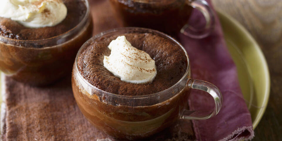 - Die Masse in vier ofenfeste Tassen füllen, im Ofen zehn bis fünfzehn Minuten backen. Der Pudding sollte eine leichte Kruste bekommen, sich darunter aber noch sehr weich anfühlen.