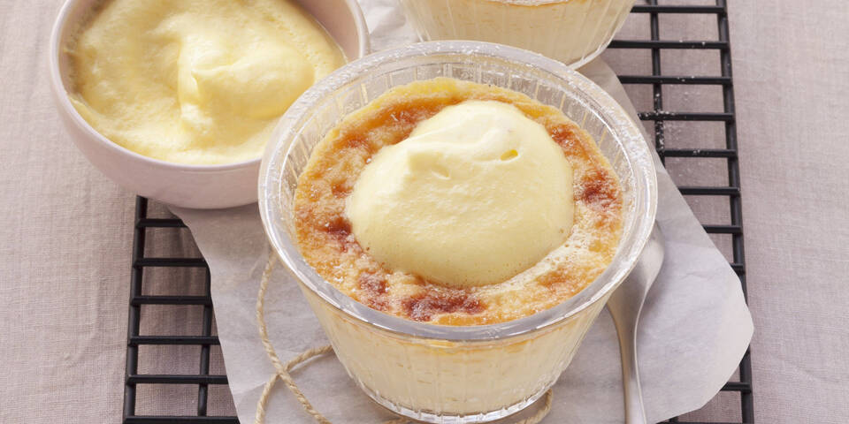 - In vier kleine Puddingförmchen (à ca. 150 ml Inhalt) füllen, auf ein tiefes Backblech stellen und bis etwa zur Hälfte der Förmchen heißes Wasser angießen. Im Ofen ca. 35 Minuten stocken und leicht bräunen lassen.