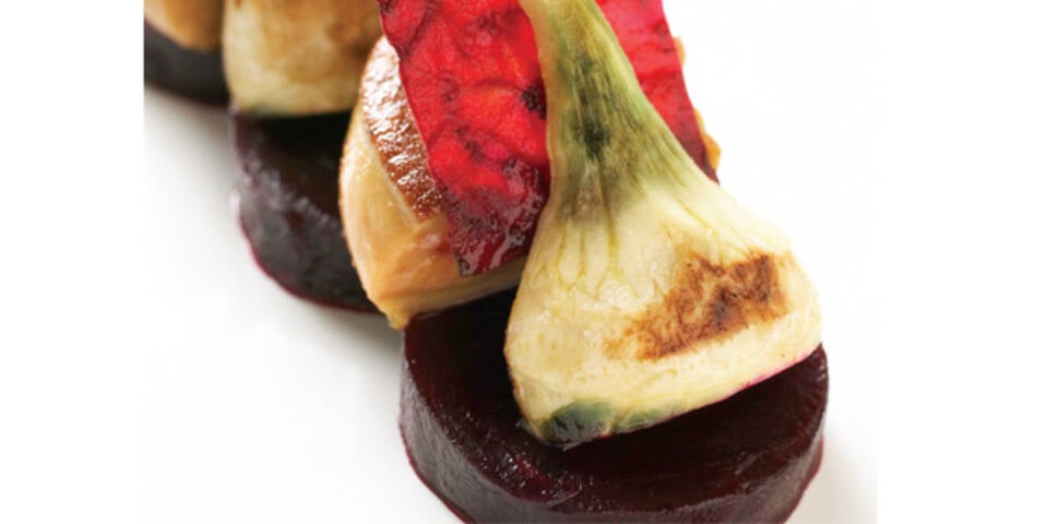 Auf jeden Teller einen Strich Rübensaft auftragen. 3 Rübenscheiben der Länge nach auflegen. Entenleber mit den Artischocken abwechselnd nebeneinander auf die Teller setzen. Darauf jeweils 3 Rübennchips setzen. Leber mit Kreuzzkümmel und Fleur de Sel bestreuen.