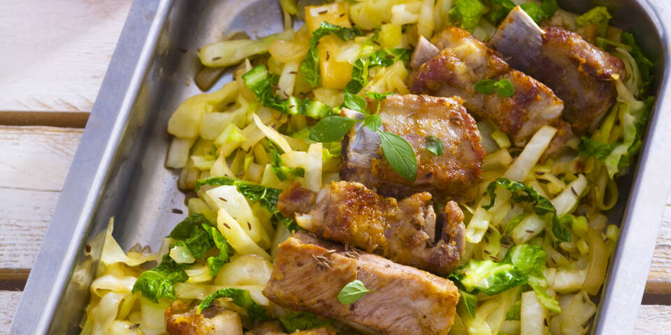 - Zwischenzeitlich Butterschmalz in einer Pfanne zerlassen und die einzelnen gut abgetropften Rippchen von allen Seiten scharf anbraten. Die Temperatur reduzieren und die Rippchen weitere 4 Minuten unter Wenden zu Ende garen. Das Gemüse noch einmal abschmecken und mit den Rippchen darauf servieren.