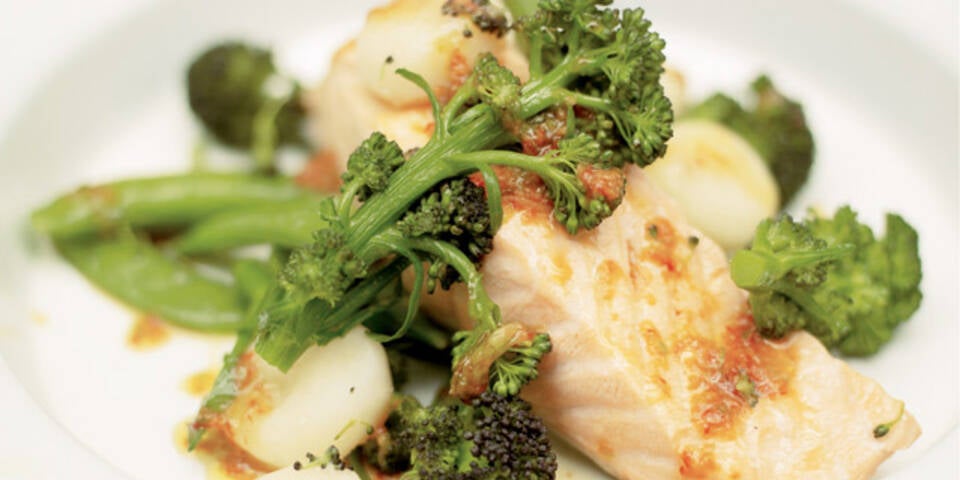 - Die Wasserkastanien in einem hitzebeständigen Durchschlag abgießen. Die Zuckerschoten hinzufügen. Die Lachsfilets mit der Hautseite nach unten darauflegen und den Brokkoli darüberstreuen. Den Durchschlag mit Alufolie abdecken, dabei am Rand rundum gut festdrücken, damit später der Dampf nicht austreten kann.