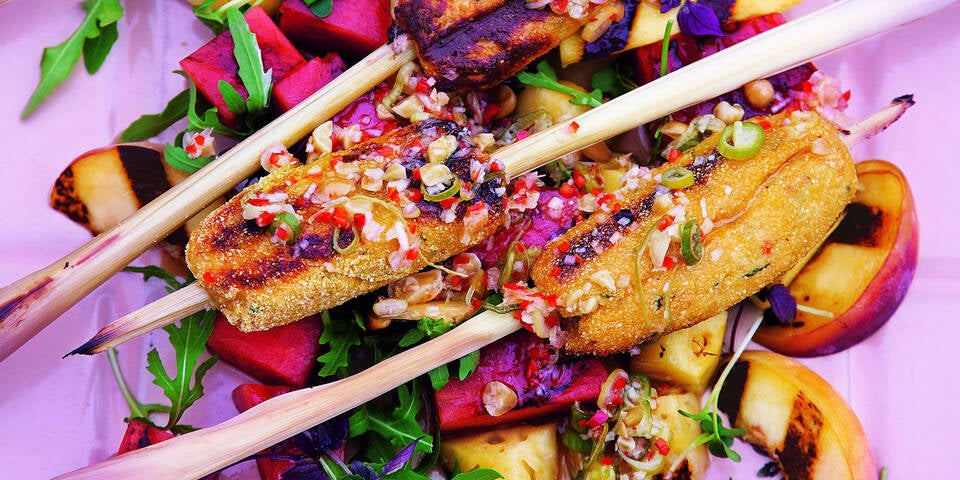 - Für den Salat Ananas schälen und halbieren, entstrunken und in Scheiben schneiden. Die Mango schälen und in Streifen vom Kern schneiden. Die Pfirsiche waschen, halbieren und entkernen. Die Melone ggf. schälen und in Scheiben schneiden. Limettenschale und -saft mit Zucker verrühren und das Obst damit bestreichen. Den Grillrost fetten und das Obst offen bei direkter Hitze grillen, bis ein Muster entsteht. Vom Grill nehmen und mundgerecht würfeln. Den Rucola verlesen, waschen und trocken schütteln.