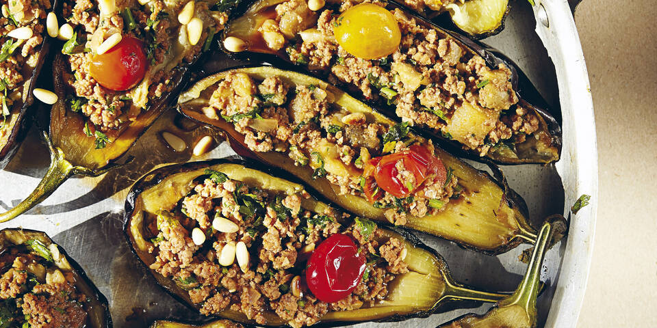 - Die Melanzanihälften in eine feuerfeste Form legen und das Fleisch jeweils darauf verteilen. Die Soße darübergeben, mit Alufolie zudecken und 30 Minuten bei 150 °C im heißen Ofen schmoren. Dann die Hitze auf 120 °C reduzieren und weitere 30 Minuten schmoren.