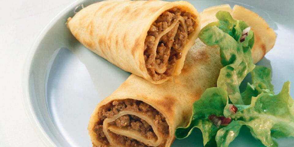 In einer weiteren Pfanne das restliche Öl erhitzen und nach und nach die Palatschinken ausbacken. Die fertigen Palatschinken im vorgeheizten Ofen warm halten. Je eine Palatschinke ausbreiten, mit 2-3 EL von der faschierten Masse bestreichen, aufrollen und halbiert auf vorgewärmte Teller angerichtet servieren. Dazu passt ein frischer, grüner Salat.