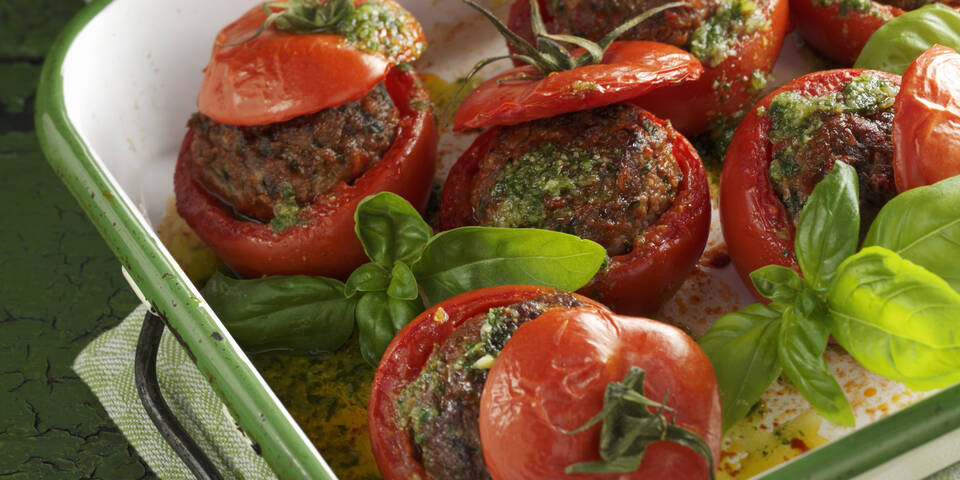 Die gefüllten Paradeiser mit dem Pesto beträufelt servieren.