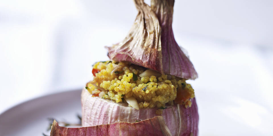 - Die Zwiebeln in eine Form stellen und mit dem Couscous füllen. Jeweils die Deckel darauf setzen und im Ofen bei 180 °C für ca. 20 Minuten backen.