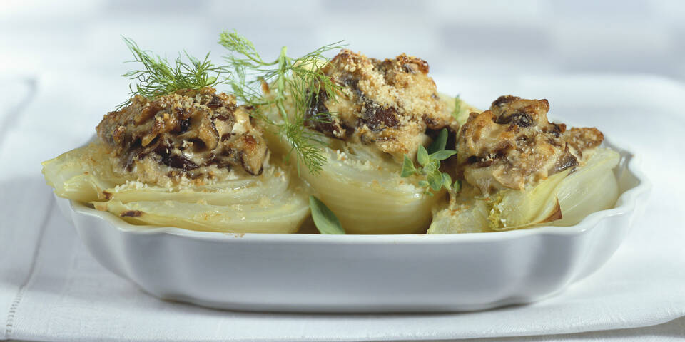 - Zwei EL der Butter in einer Pfanne erhitzen und die Zwiebel- und Knoblauchwürfel sowie die Pilze darin andünsten. Dann mit der restlichen Butter und den Semmelbröseln mischen. Mit Salz und Pfeffer abschmecken und etwas Thymian zugeben. Die Mischung auf die Fenchelhälften verteilen. In eine Auflaufform geben, den Fond angießen, die Lorbeerblätter zugeben und im Ofen ca. 15 Minuten gratinieren. Mit Fenchelgrün garniert servieren.