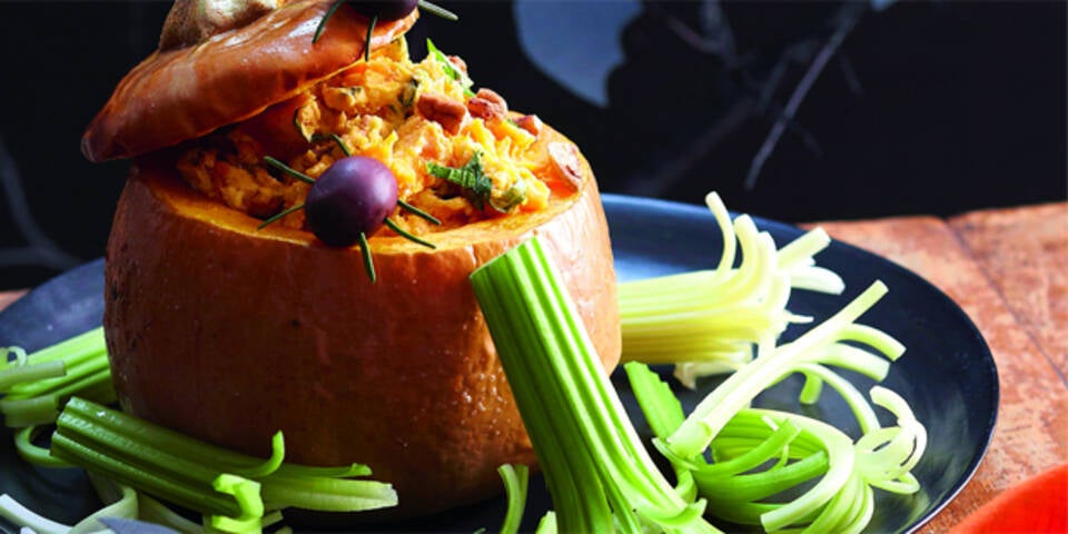 2. Den Kürbis auf das Backblech setzen und im vorgeheizten Ofen 35–40 Minuten weich garen. Für die Käferdekoration die Oliven mit Rosmarinnadeln spicken. Den Sellerie putzen, waschen und in ca. 8 cm lange Stücke schneiden. Mit einem scharfen Messer an einer Seite mehrmals ca. 2 cm tief einschneiden, sodass kleine Besenstiele entstehen. Anschließend in Eiswasser legen.