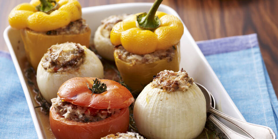 - Den Reis in 250 ml kochendem Salzwasser bissfest garen. Die Paprikaschoten und Paradeiser waschen, jeweils einen Deckel abschneiden und das Gemüse aushöhlen. Die Zwiebeln schälen und in Salzwasser ca. 15 Minuten weich kochen. Abschrecken, einen Deckel abschneiden und aushöhlen. Den Backofen auf 200 °C vorheizen.