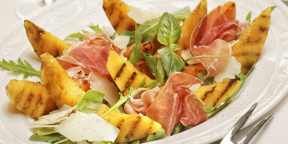 - In einer Grillpfanne unter Wenden ca. 10 Minuten grillen. Den Rucola auf Tellern anrichten. Den Schinken in Stücke zupfen und darauf drapieren. Die Melonenspalten auf den Salat legen und den Parmesan (z. B. mit einem Sparschäler) darüber hobeln. Mit dem übrigen Zitronensaft beträufeln und mit Basilikum garnieren.