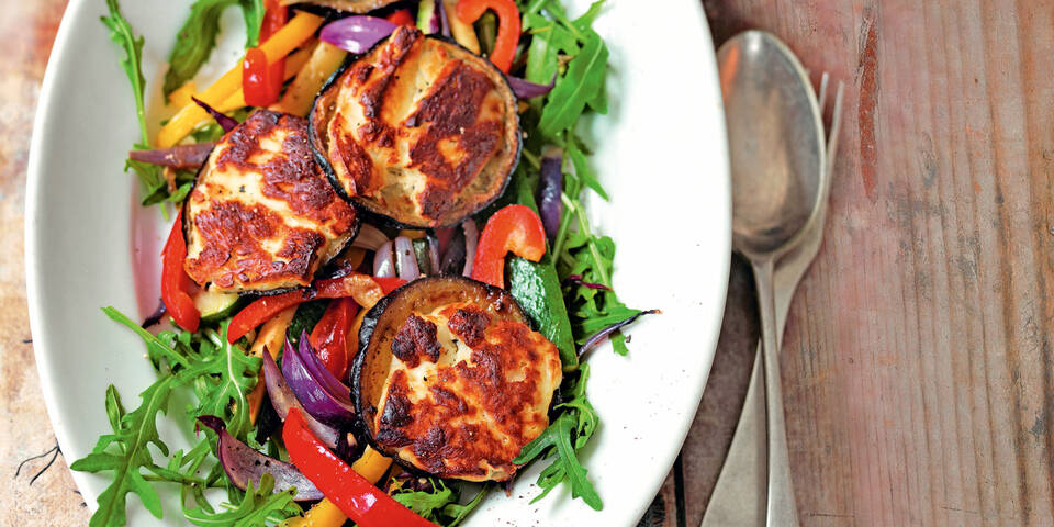 - Den Rucola waschen, trocken schütteln und in einer flachen Schale oder auf Tellern verteilen, das gebratene Gemüse darauflegen und mit den Melanzani-Scheiben belegen.