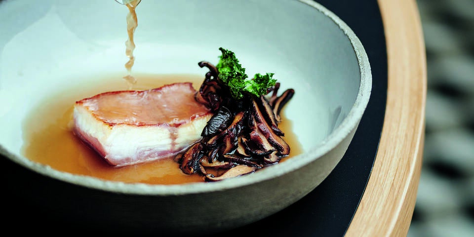 5. Shiitake in Streifen schneiden, Strunk entfernen und für die Suppe beiseitestellen. Pilze in etwas Öl in einer Pfanne scharf angrillen und mit Ponzu-Sauce ablöschen. So lange weiterbraten, bis die ganze Flüssigkeit verdampft ist, erst danach die Pilze salzen.