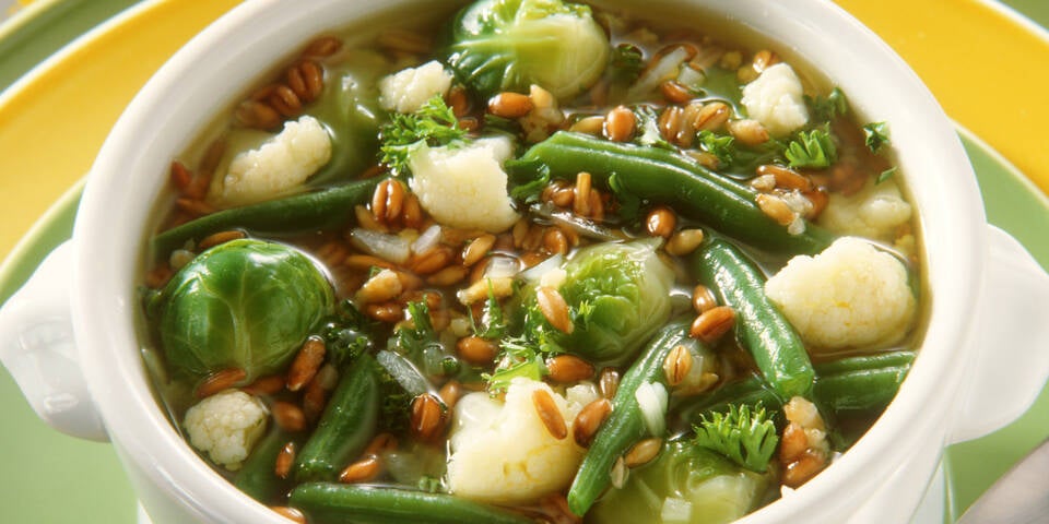 - Den Weizen mit Wasser bedecken und über Nacht quellen lassen. Die Kohlsprossen putzen, waschen und kreuzförmig am Strunk einschneiden. Den Karfiol putzen, waschen und in Röschen teilen. Die Fisolen putzen, waschen, Enden abknipsen, halbieren.
