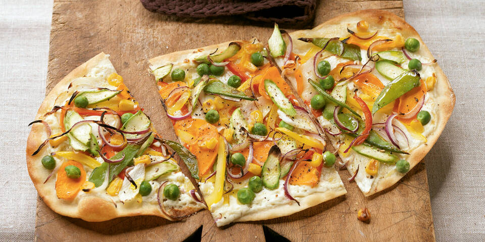 - Den Teig zu einem Fladen ausrollen oder vier gleich große ausrollen, auf das Backblech legen. Die Sauerrahmmasse auf den Teig streichen, das Gemüse darauf verteilen und mit Salz und Pfeffer würzen. Den Flammkuchen und die Paprikaschoten gleichzeitig in den Backofen schieben und in 15–20 Minuten goldbraun backen.