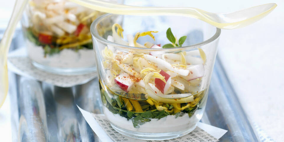 - Das Tsatsiki auf 4 Gläser verteilen, die Kräutermischung darüber streuen und den Sprossensalat daraufgeben. Bis zum Servieren im Kühlschrank kalt stellen.