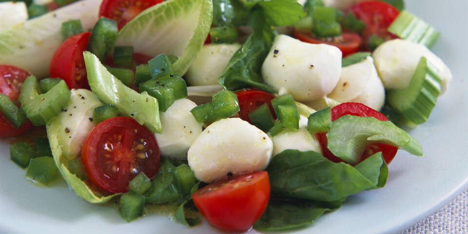 - Den Chicoree sowie den Romanasalat in Blätter teilen, waschen, trocken schütteln und nach Belieben kleiner zupfen. Den Mozzarella abtropfen lassen. Die Basilikum-Blätter waschen und klein schneiden.