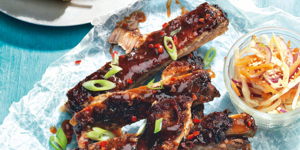 - Die Rippen portionieren und mit Lauchzwiebeln und Peperoniwürfeln bestreut servieren. Die restliche Sauce separat dazu reichen. Dazu passen Coleslaw und Maiskolben.