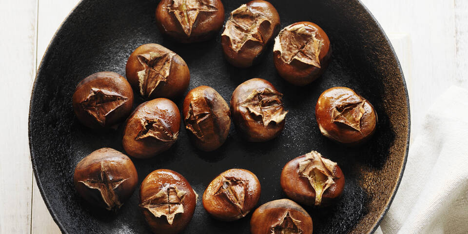 Die Maroni mit einem spitzen, scharfen Messer kreuzweise einritzen. Eine schwere Eisenpfanne erhitzen, die Maroni zufügen und unter gelegentlichem Wenden braun rösten, bis die Schalen aufplatzen. Herausnehmen, ganz kurz abkühlen lassen und schälen.