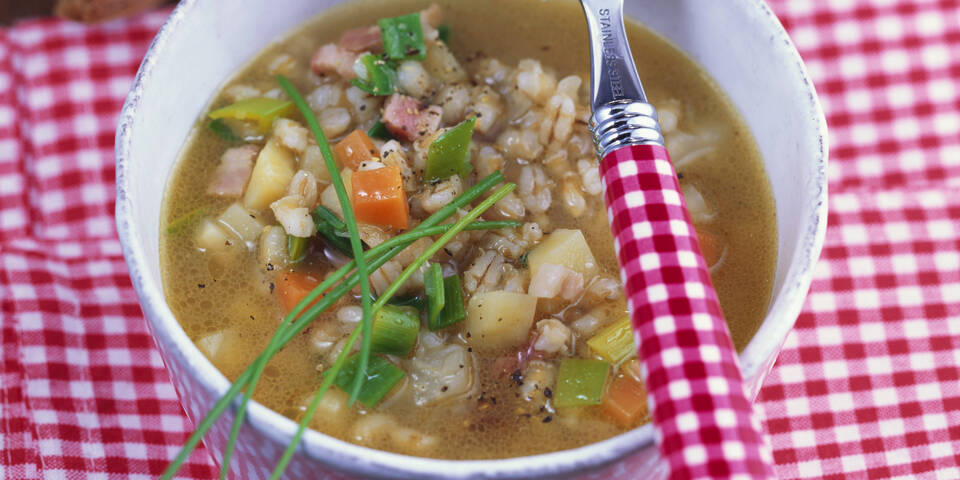 - Die Gerste waschen und sehr gut abtropfen lassen. Die Zwiebel schälen und fein hacken. Den Speck würfeln und in einer Pfanne ohne Fett anbraten. Die Gerstenkörner und Zwiebeln dazugeben, mitbraten, salzen, pfeffern, mit Muskatnuss würzen und mit dem Fleischfond aufgießen. 20–25 Minuten leise köcheln lassen.