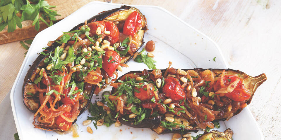- Den Bräter aus dem Ofen nehmen, die Zwiebel-Paradeiser-Mischung samt Saft auf die Melanzani verteilen, sodass sie schön damit bedeckt sind und etwa 10 Minuten stehen lassen. Dann mit den Pinienkernen sowie Petersilie oder Minze bestreuen und servieren. Dazu passt grüner Salat und/oder Reis.