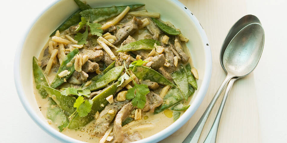 - Zucker im Topf karamellisieren lassen, Nüsse, Nusscreme, Currypaste, Kokosmilch und Obers zugeben. Bei mittlerer Hitze ca. 10 Minuten köcheln lassen. Zuckerschoten und Bambussprossen zugeben und weitere ca. 5 Minuten garen. Zum Schluss das Fleisch mit dem Knoblauch und Ingwer ergänzen und mit Sojasauce und Fischsauce abschmecken.