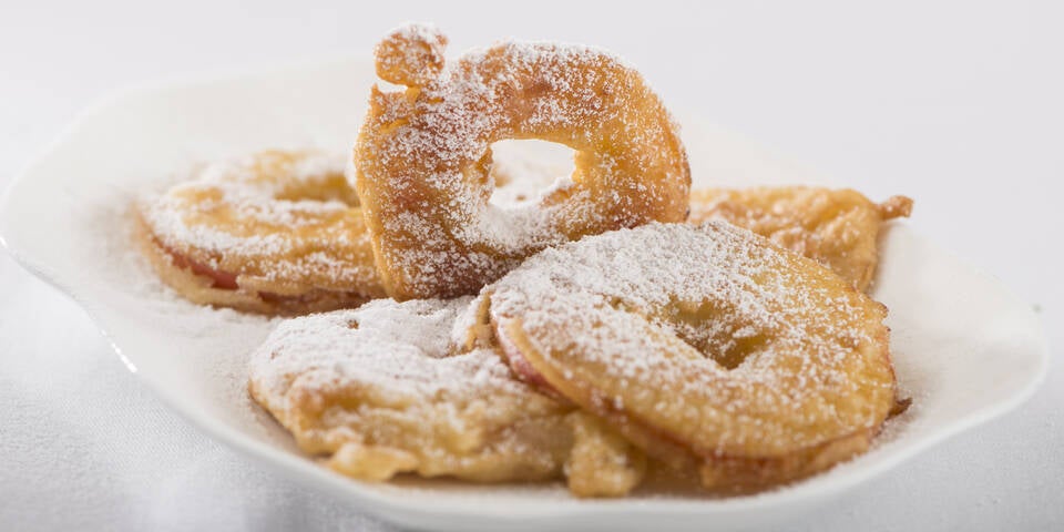 - Apfelscheiben einzeln durch den Teig ziehen und in Öl knusprig in einer hohen Pfanne herausbacken.