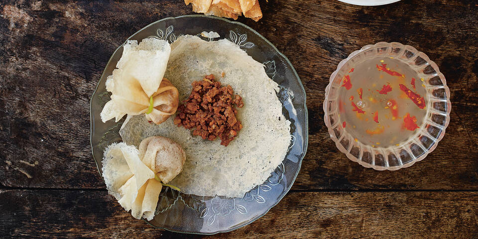 - Für die Füllung Garnelen, Schweinefleisch, Saam-Gler, Sojasauce, Wasserkastanien und Zucker in einer großen Schüssel gut vermengen. Teigblätter vor dem Füllen mit Frischhaltefolie abgedeckt mindestens 10 Minuten im Kühlschrank ruhen lassen.