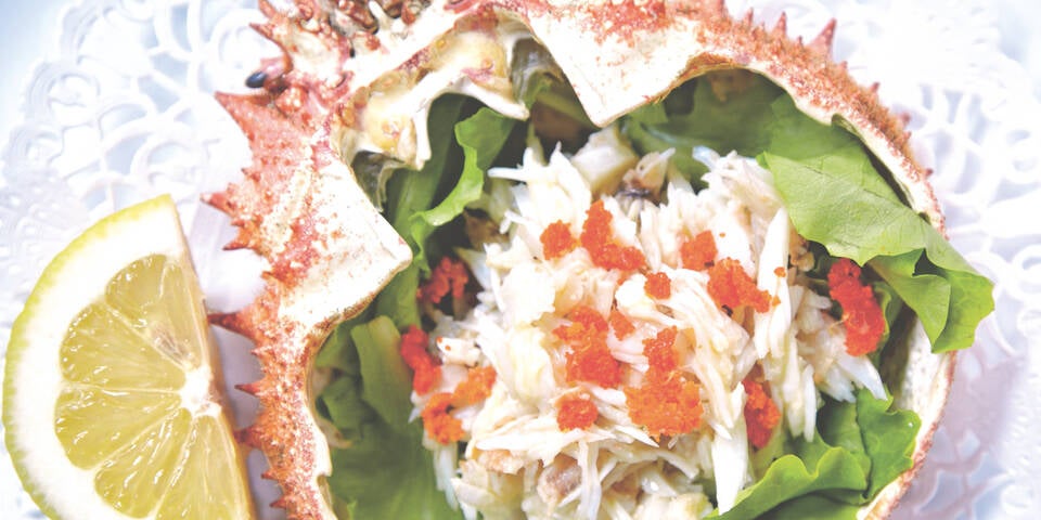 - In die leeren, gereinigten Panzer – nach Belieben auf einigen Salatblättern – das Seespinnenfleisch füllen. Zusammen mit dem Rogen servieren. Bei Raumtemperatur verzehren.