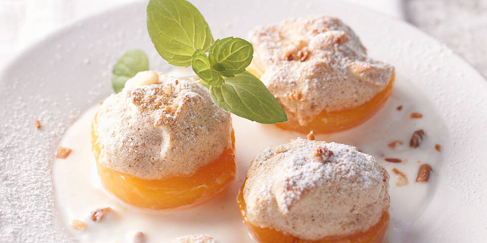 - Dann die Mandeln und das Bittermandelaroma unterziehen. Den Baiser auf die Marillen verteilen. Die Amaretti zerbröseln und darüberstreuen. Nochmals 5–10 Minuten backen, sodass der Baiser leicht hellbraun wird.