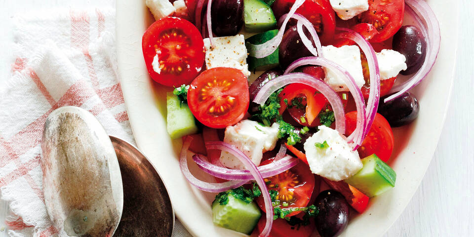 - Den Feta abtropfen lassen und in 1 cm kleine Würfel schneiden. Die Oliven ebenfalls gut abtropfen lassen, mit den Paradeisern, der Gurke, dem Feta und der Petersilie mischen, salzen, pfeffern und in Schalen verteilen. Mit den Zwiebelstreifen belegen und mit Olivenöl beträufelt servieren.