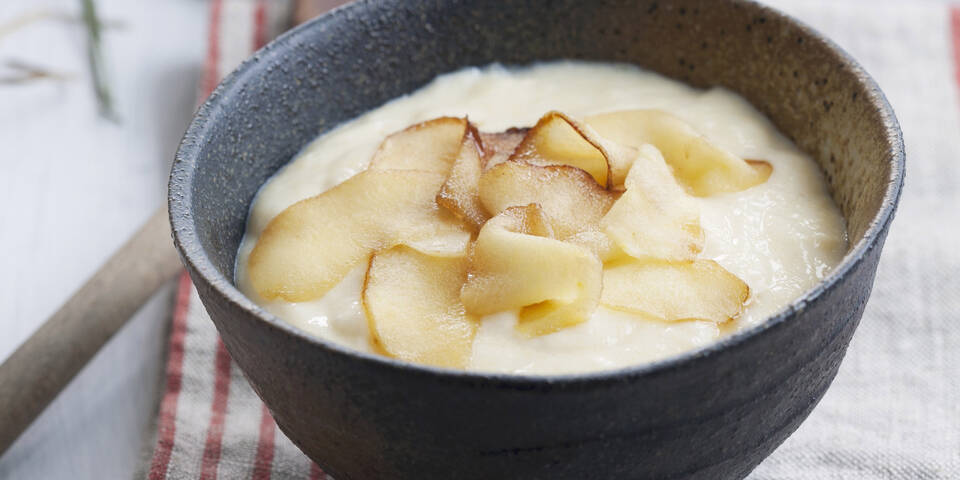 - Den Grießbrei auf Schüsseln verteilen (Orangenschale vorher wieder entfernen), die Äpfel darüber geben und servieren.
